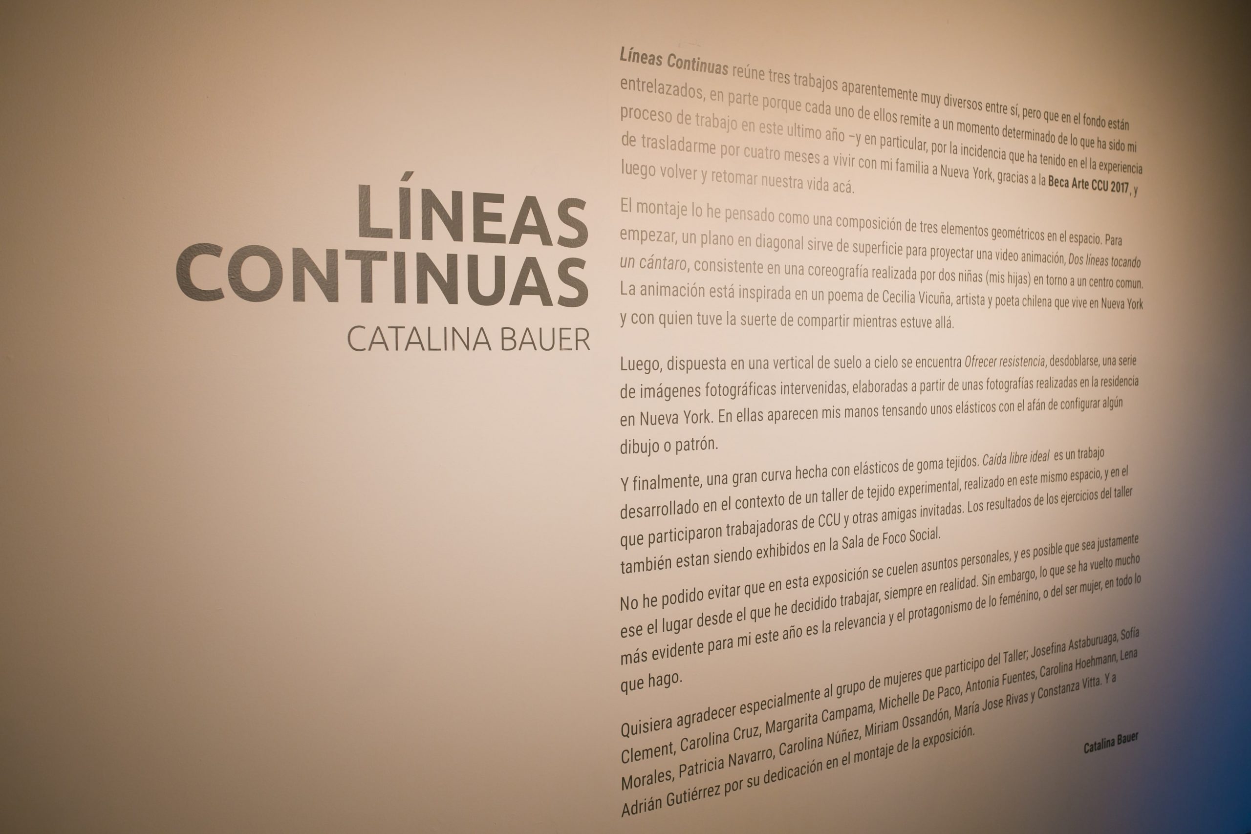 La Exposición “Líneas Continuas” de la artista Catalina Bauer, presenta parte del trabajo realizado durante su residencia en el International Studio and Curatorial Program (ISCP), Nueva York, como ganadora de la Beca Arte CCU 2017; y una obra de gran escala elaborada en conjunto con un grupo de mujeres, trabajadoras de CCU y otras invitadas, en un breve taller de participación realizado durante el mes de noviembre recién pasado.