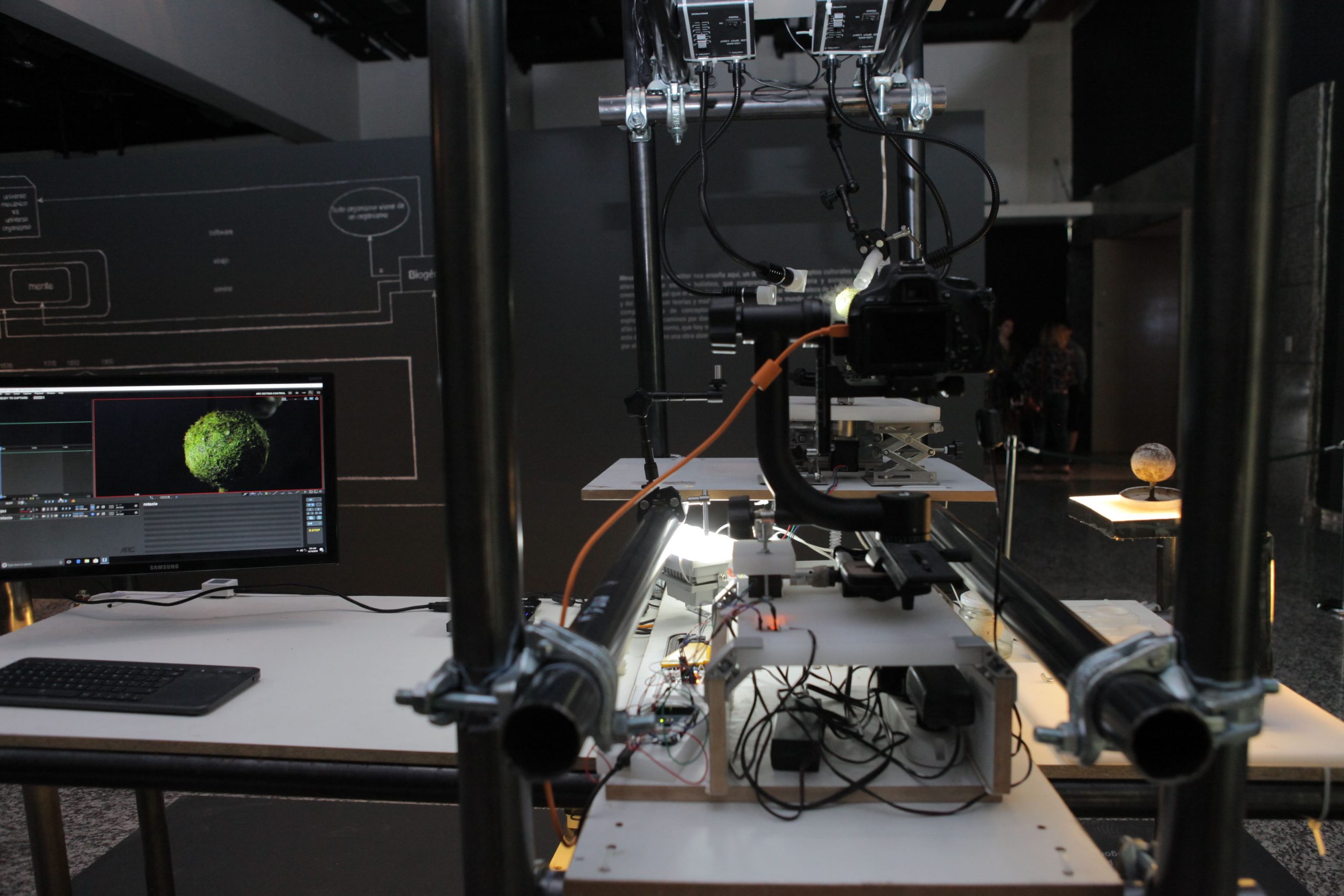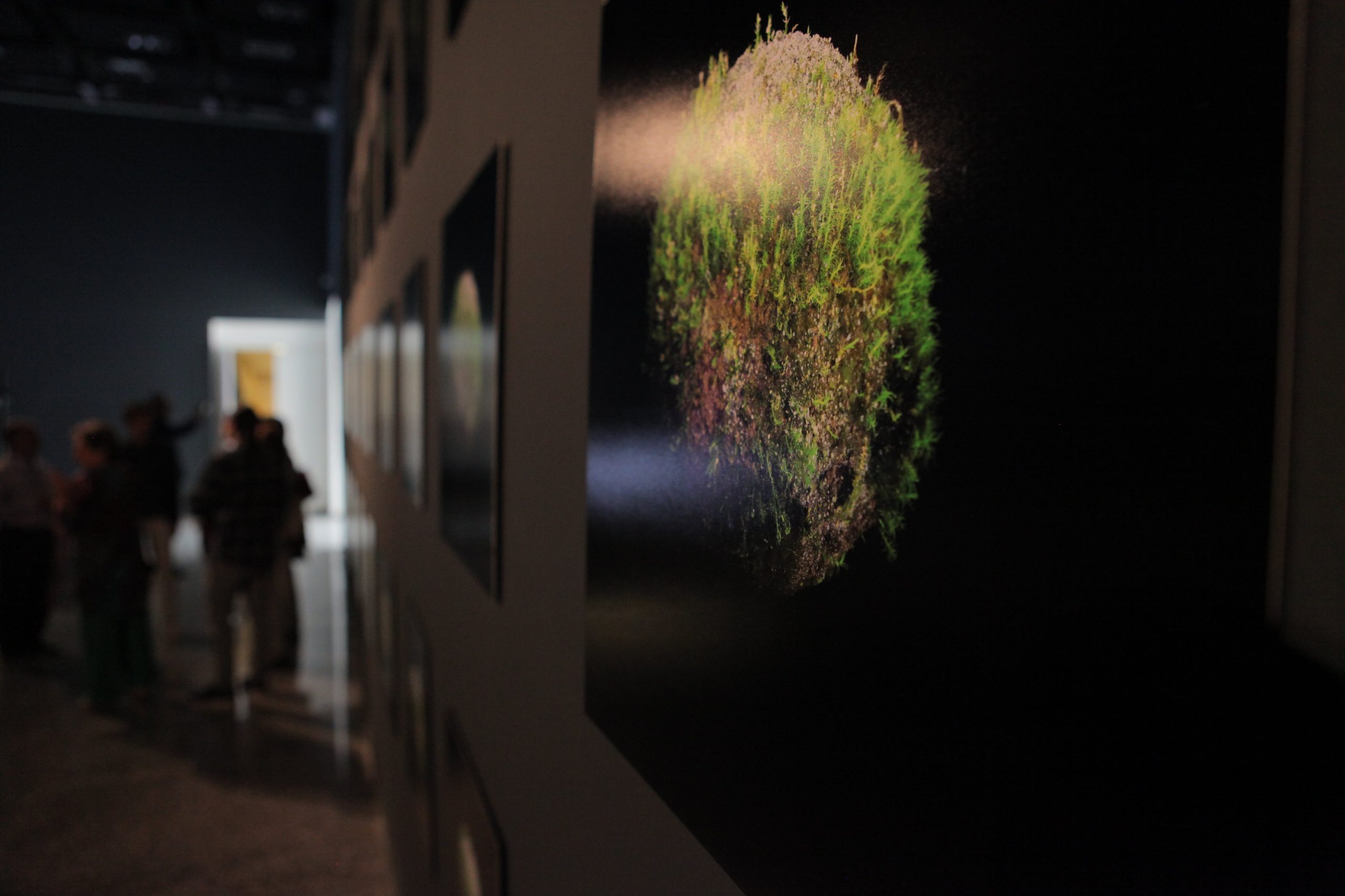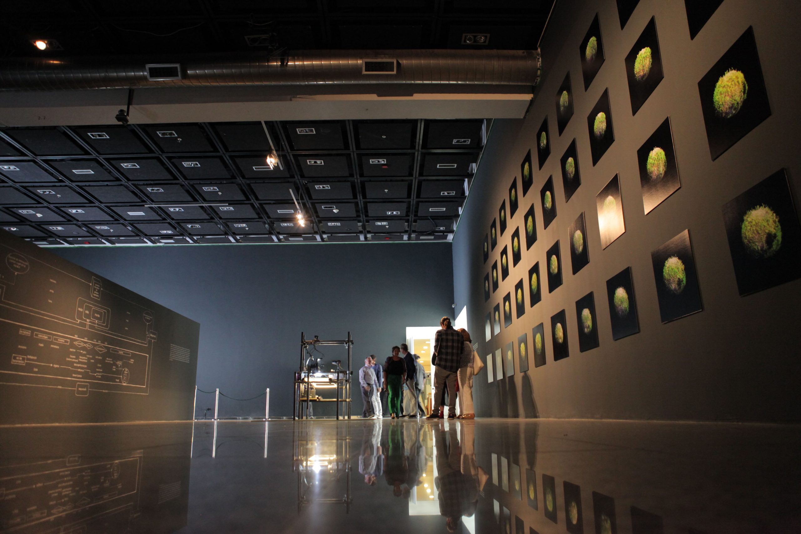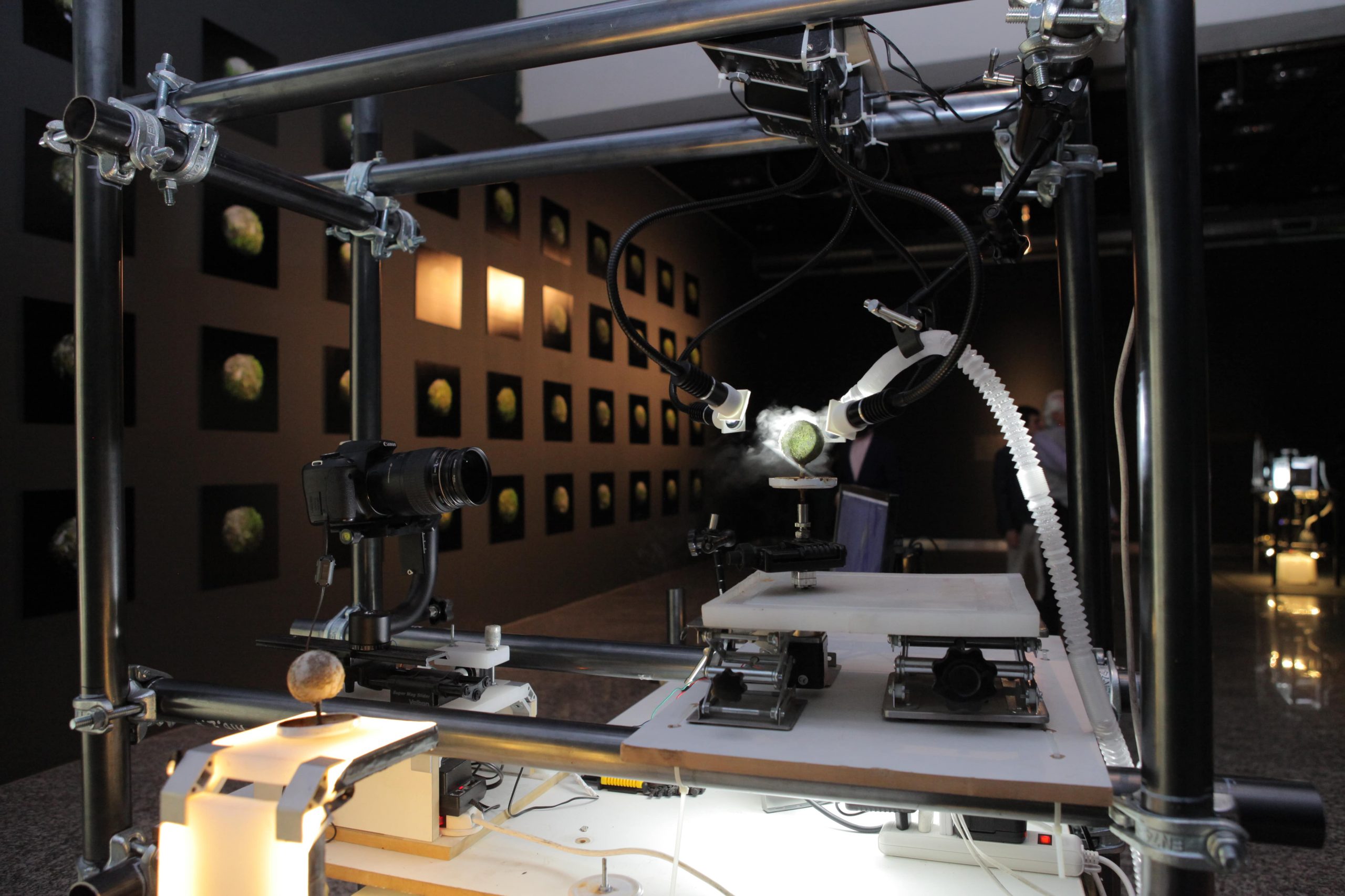 “Microinfinito” se compone de dos instalaciones. La primera, “Panspermia” y “Biogénesis”, incubadoras de micro plantas donde lentamente se va gestando el origen de la vida en la tierra y el desarrollo material de la obra, como musgos, hongos y diminutos organismos que surgen en la forma de células organizadas. La segunda es “Microinfinito”, un registro visual de 40 imágenes que el artista capturó por 147 días y que permite examinar la vida de los micromundos y cómo el paso del tiempo los afecta directamente.