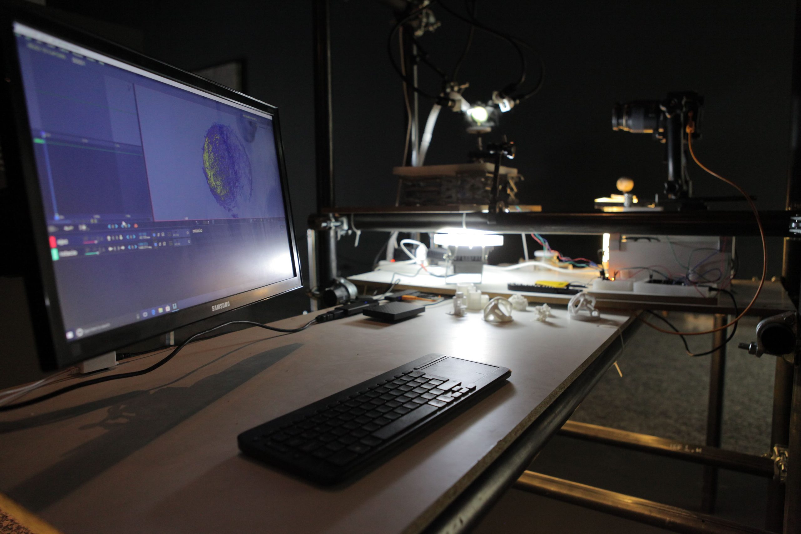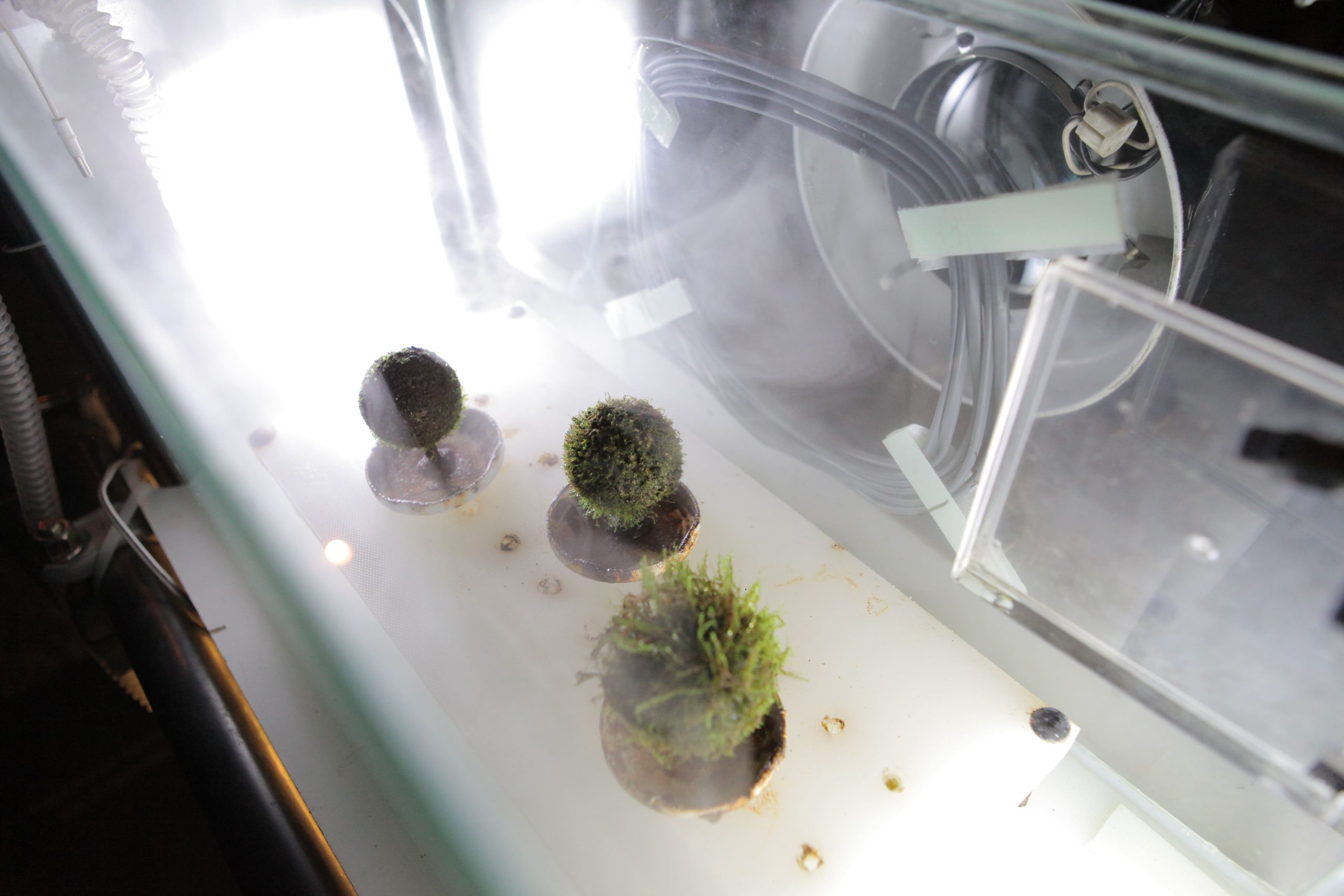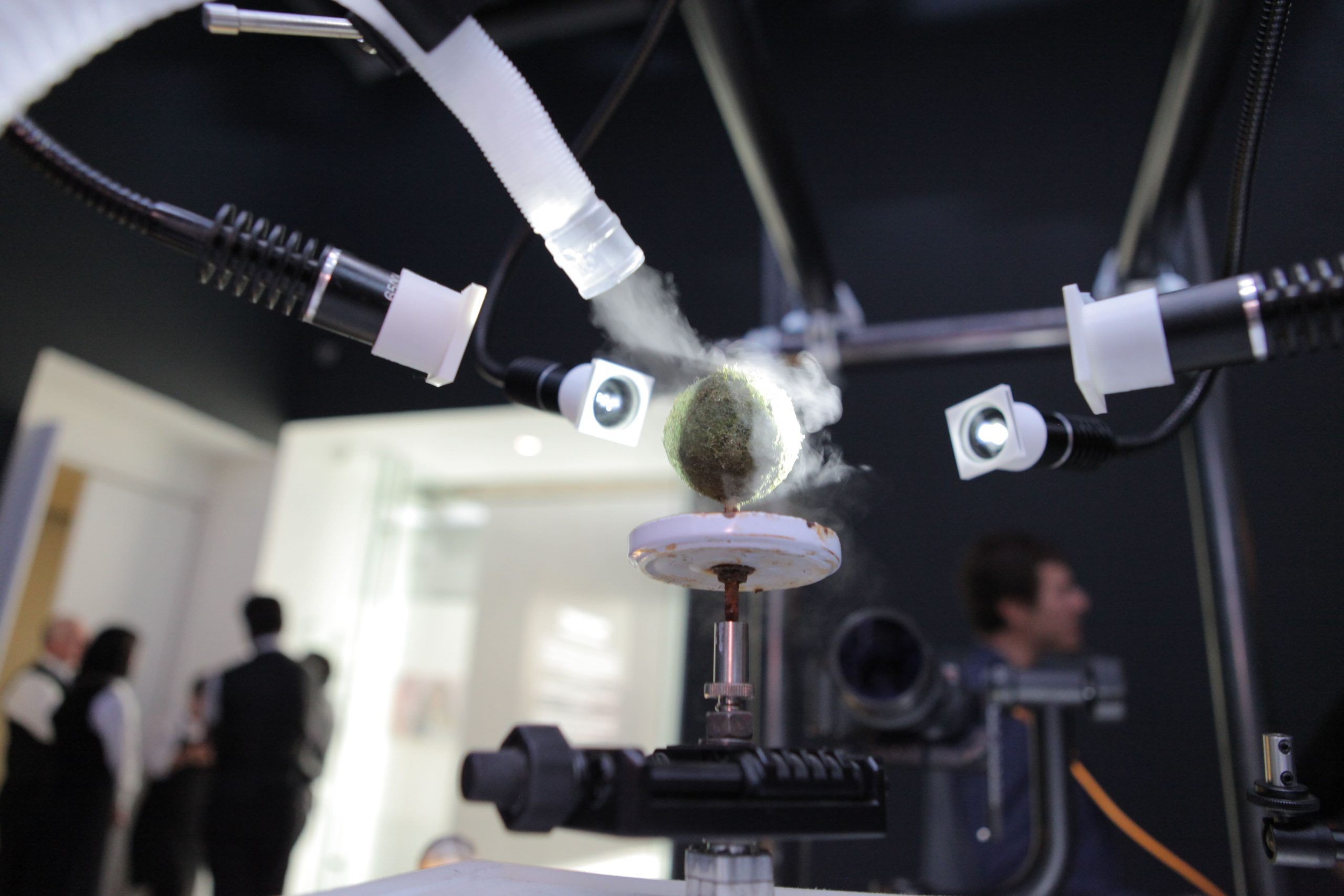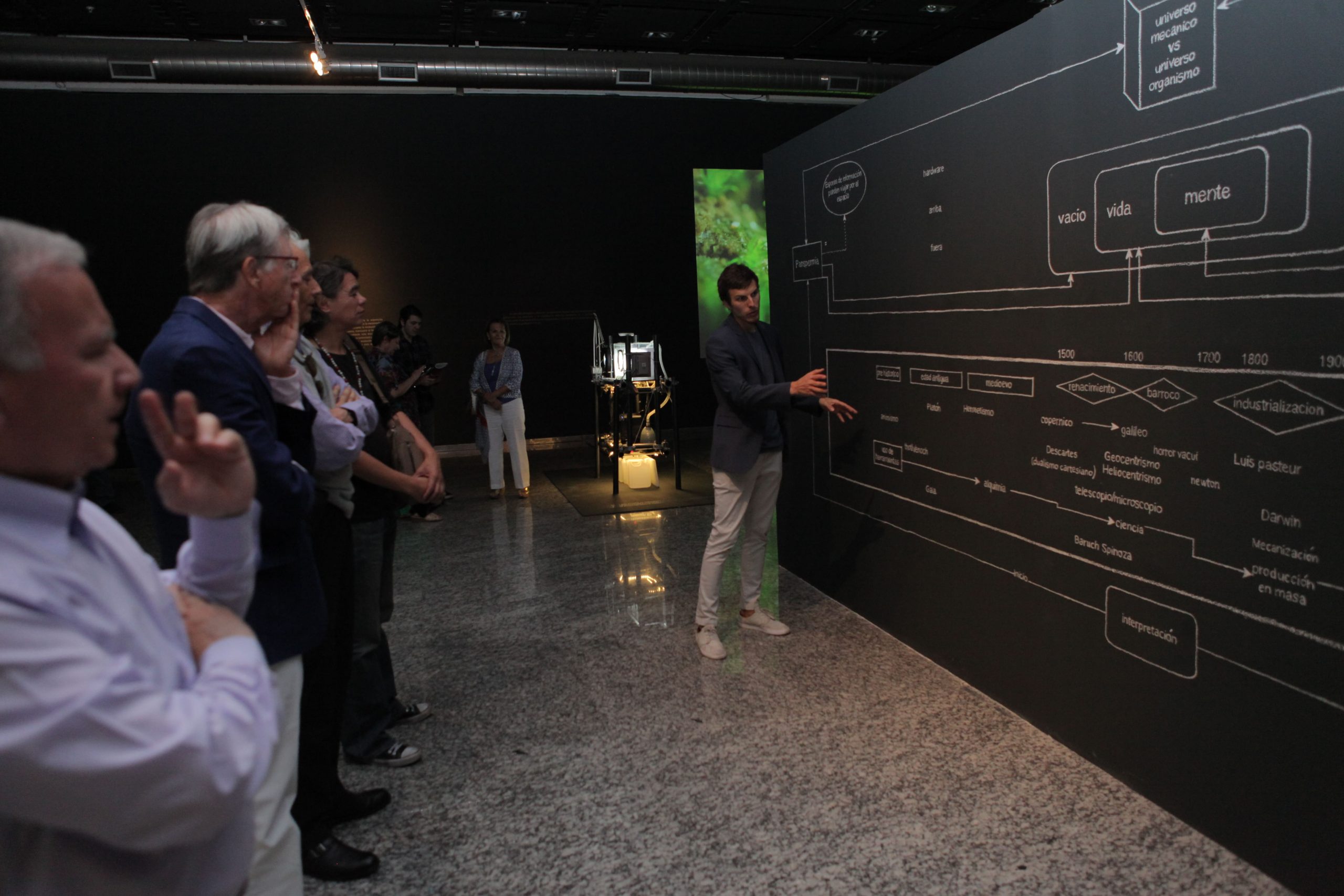 “Microinfinito” se compone de dos instalaciones. La primera, “Panspermia” y “Biogénesis”, incubadoras de micro plantas donde lentamente se va gestando el origen de la vida en la tierra y el desarrollo material de la obra, como musgos, hongos y diminutos organismos que surgen en la forma de células organizadas. La segunda es “Microinfinito”, un registro visual de 40 imágenes que el artista capturó por 147 días y que permite examinar la vida de los micromundos y cómo el paso del tiempo los afecta directamente.