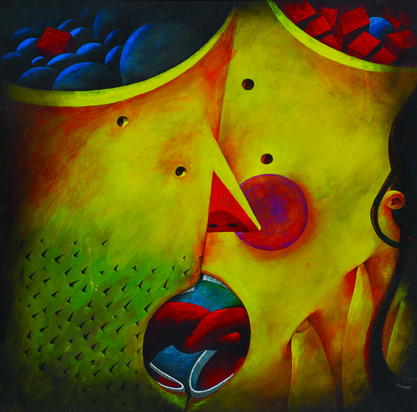 La imagen representa a dos personas que se están besando, y con el gesto corporal expresan la necesidad que tienen uno del otro. La caricaturización de este tipo de escenas son las preocupaciones que tiene este ilustrador: conseguir que ciertos actos sean llevados al campo de la ironía pero a la vez de una fría inocencia gráfica. Los colores básicos como el amarillo, rojo y azul son mezclados para dar cierta profundidad a la escena con veladuras, mientras que la línea se sobrepone a las capas de color para contener y uniformizar las formas que aparecen en la imagen.