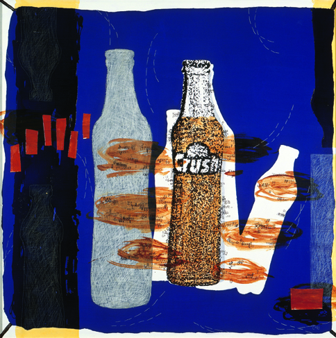 En “Crush” se observa la presencia de una botella de gaseosa que se proyecta cuatro veces en el fondo, mientras que lo que parece ser la botella de otra gaseosa se plasma en la franja izquierda del cuadro. La insignificancia de estos objetos cotidianos, hacen posible que el espectador se concentre más bien en como ha sido resuelto la representación pictórica en la superficie plana del cuadro. Así es posible observar que el artista intervino el cuadro con la presencia de formas de tonalidades cafés que interviene a la botella y sus proyecciones sobre el fondo a la vez que el gran fondo en tonalidades azules es intervenido por pequeñas tonalidades cafés y rojas.