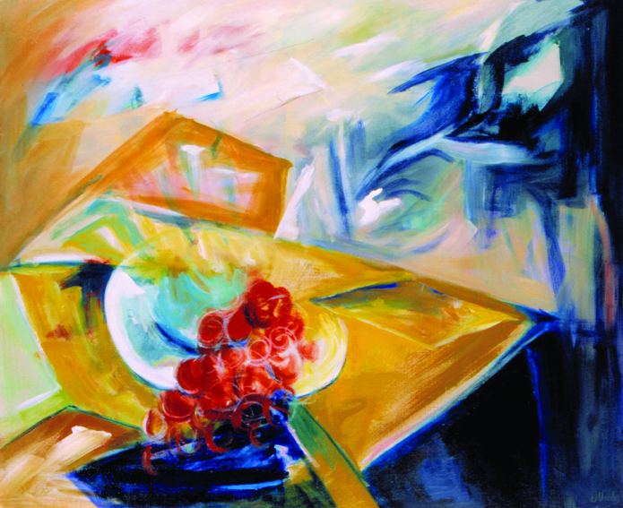 La artista cuestiona el espacio mediante una abstracción que se traduce en su fragmentación, como resultado de sucesivas y yuxtapuestas áreas cromáticas que van transformando el fondo en una superficie pictórica, donde es difícil reconocer un segundo plano. También destaca el trabajo plástico en torno a los objetos, es decir, a las uvas y el plato. Aquí se da una interesante tensión visual producto de la deformación intencional de la perspectiva, lograda a partir del levantamiento casi frontal del plato.