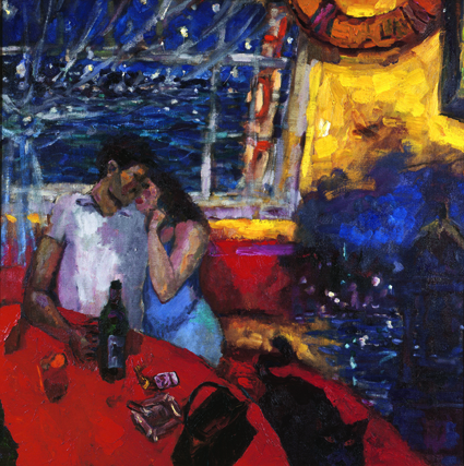 En “Gato”, el artista nos presenta a una relajada pareja que disfruta de un instante íntimo, sentada y bebiendo junto a una mesa en un entorno natural que acentúa la tranquilidad. Sin embargo, esta escena está lejos de ser una representación fotográfica de la realidad. Por el contrario, el dibujo se estructura de acuerdo a la intención expresiva del artista, por eso es fuerte, lleno de texturas y pinceladas vigorosas, mientras que los detalles o elementos secundarios pierden definición para que destaque sólo lo esencial. De igual forma el color, rico en tonalidades rojas, azuladas y amarillas, se observa saturado, lleno de fuerza expresiva y vigor sensual.