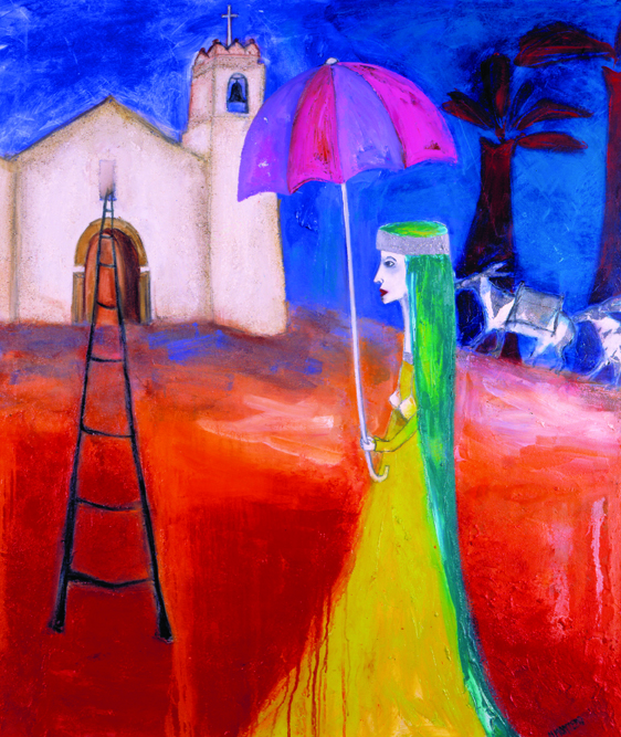 En este caso apreciamos a una mujer vestida de novia, que se protege con un quitasol o paraguas justo antes de entrar a la iglesia. La escena es desolada, sin más presencia que la de la mujer y dos animales que se visualizan en el fondo, lo que le otorga cierta ambigüedad a la atmósfera del cuadro, a la vez que centra toda la importancia de la pintura en su sencillez compositiva y en la libre y creativa fuerza cromática., en donde predominan los rojos, azules, verdes y blancos.