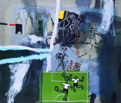 En “Obstáculo Eliminados” Benmayor nos presenta una obra que se aleja claramente de los cánones academicistas, para plasmar una escena trivial que se transforma en un pretexto para concentrarse en los valores puramente plásticos. Botellas, jugadores de fútbol, personas y hasta una bicicleta se despliegan imitando el dibujo de los niños y acentuando aún más su distancia con la academia. La desenfadada ruptura con valores como la proporción o la perspectiva, dan paso a una obra que rescata la espontaneidad del trazo, el vigor del gesto pictórico, la arbitrariedad cromática e incluso cierta dosis de humor. Todo ello se conjuga para generar una pintura exuberante, llena de sensualidad y creatividad individual. Un verdadero goce personal.